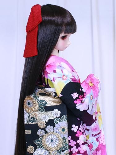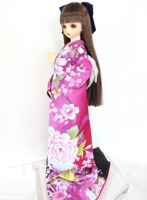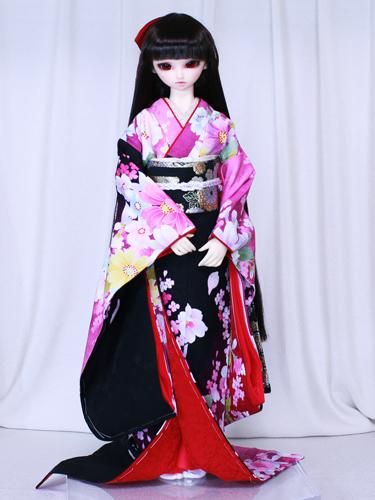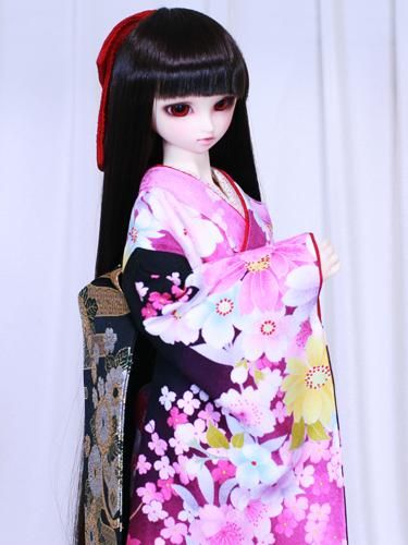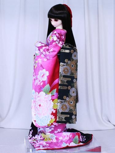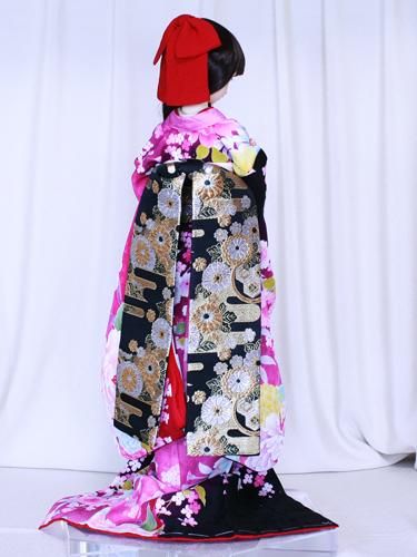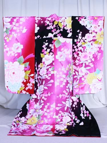 特徴  黒と桃色の暈かしに桜と牡丹が描かれた大人っぽいお振袖です。