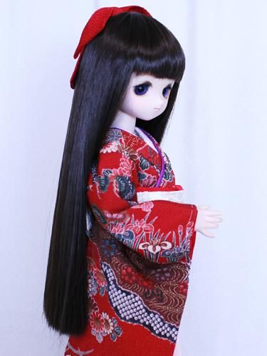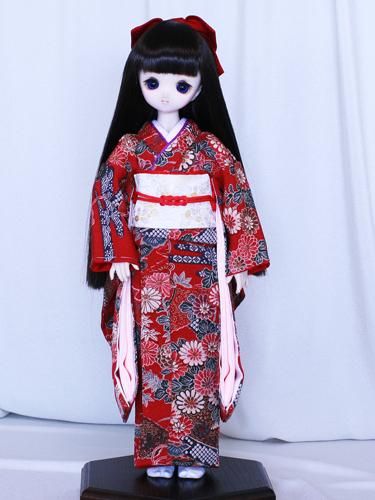 濃い柿色の縮緬に紅葉や菊、菖蒲などが描かれています。