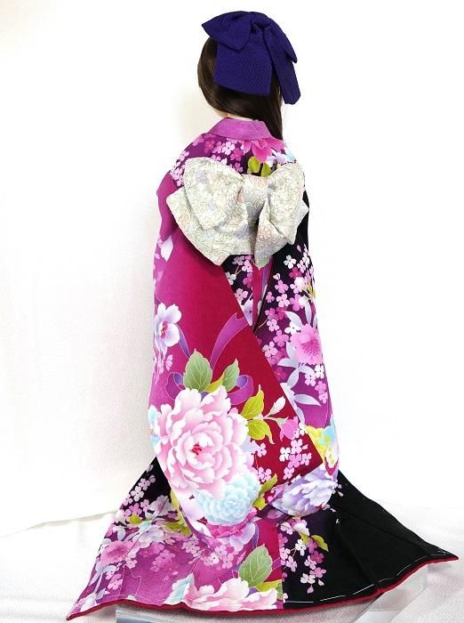 k-1048 裾引き振袖 黒地と桃色の暈かし」に合わせています。